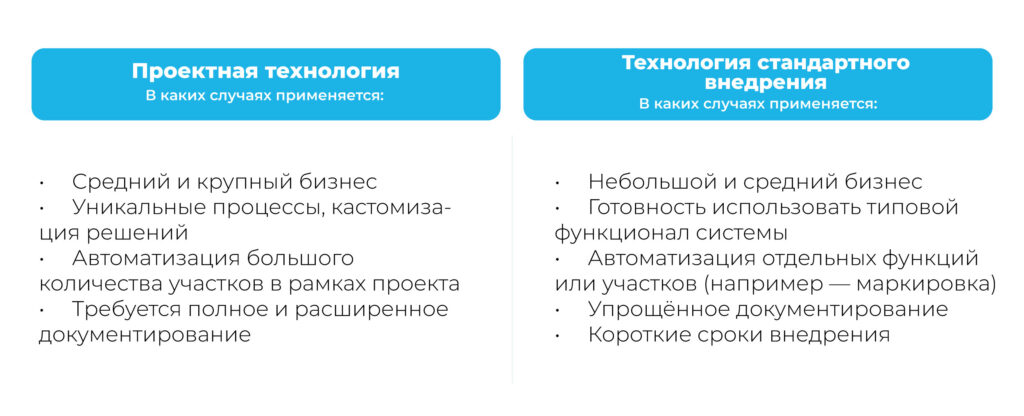 Различные технологии обусловлены уровнем сложности и стандартизации бизнес-процессов на объекте автоматизации, степенью готовности Заказчика адаптировать свои бизнес-процессы под типовые возможности системы, интенсивностью работы предприятия, потребностью в быстрой адаптации системы к часто меняющимся бизнес-процессам в организации.